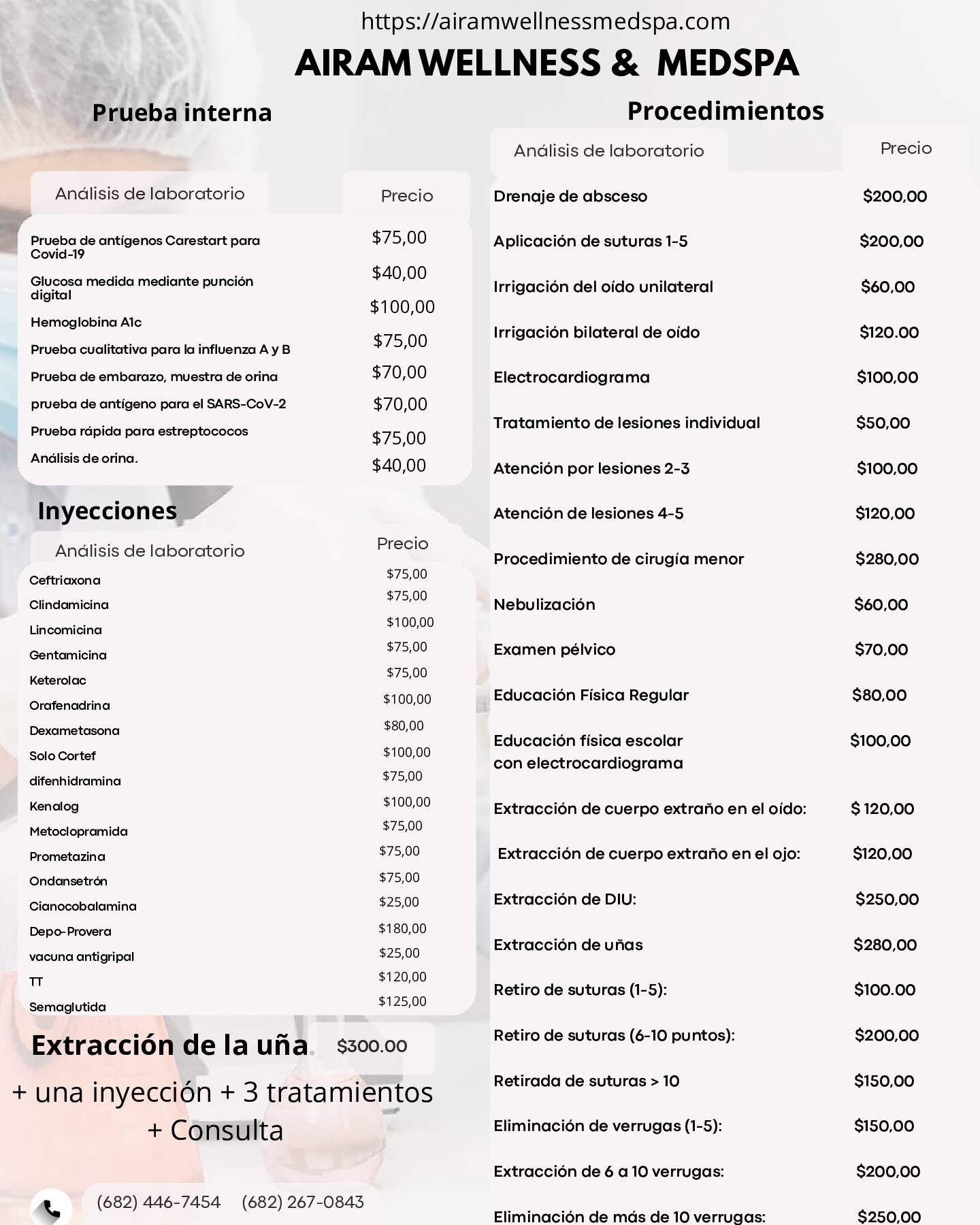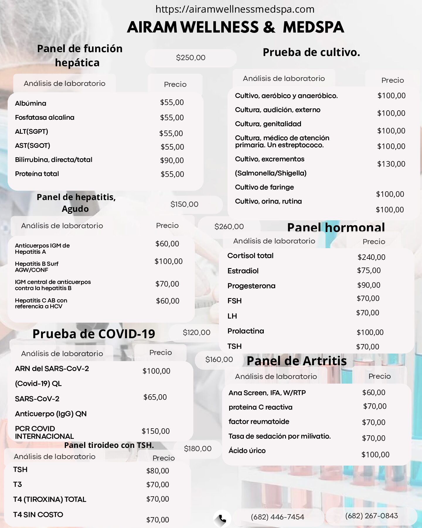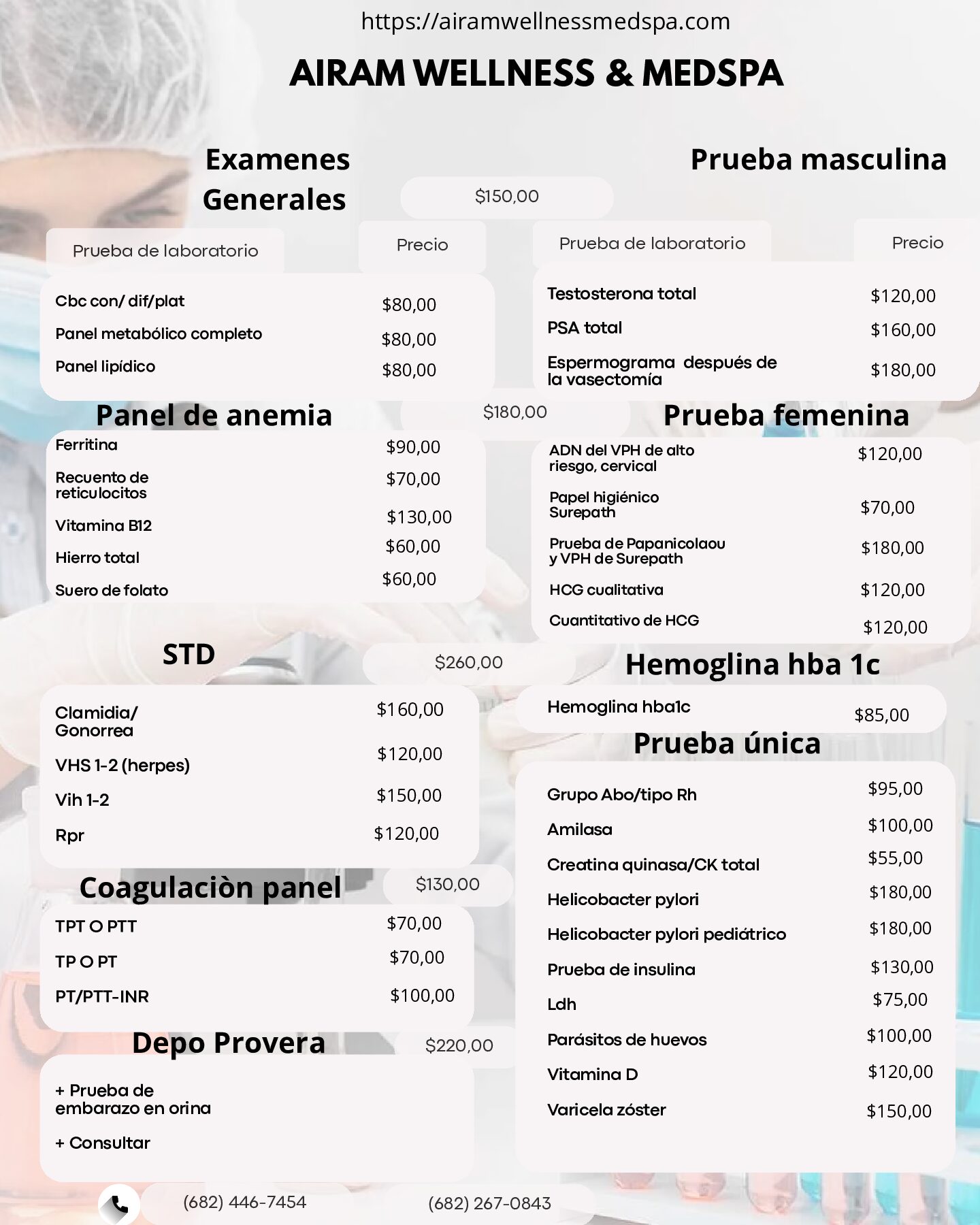 General, Thyroid panel, HBA1C, Hormona panel, Examen de Orina, Glucosa, Pregnancy test